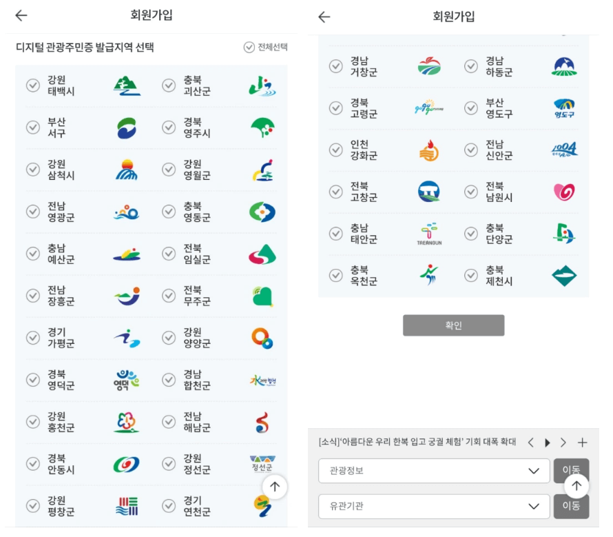 3. 원하는 지역의 관광주민증을 받습니다. 전체를 선택하면 좋습니다.