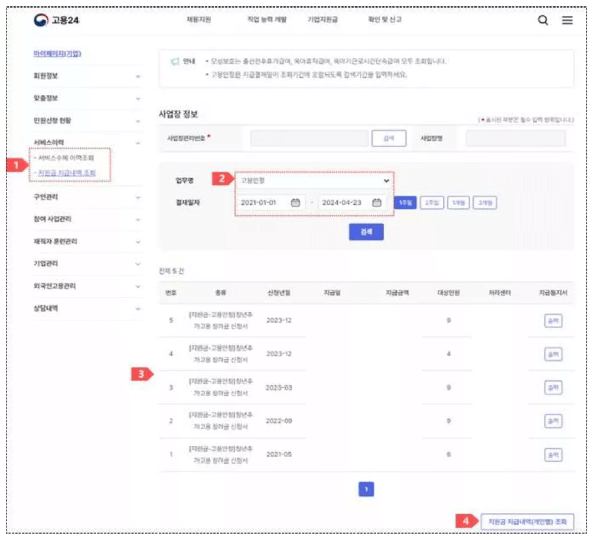 4. 지원금 지급내역 조회는 서비스이력에서 확인이 가능합니다.